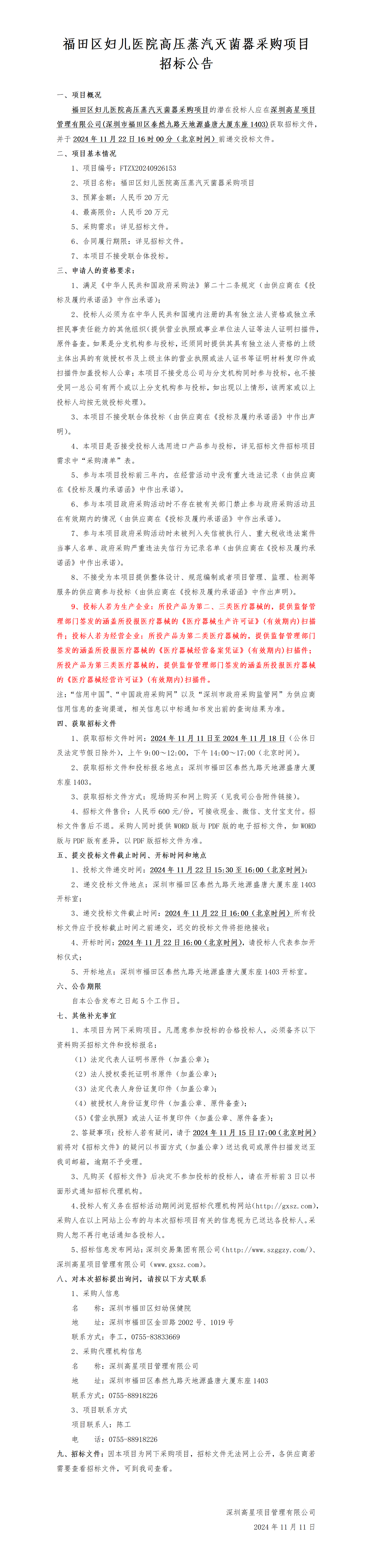 【招标公告】福田区妇儿医院高压蒸汽灭菌器采购项目