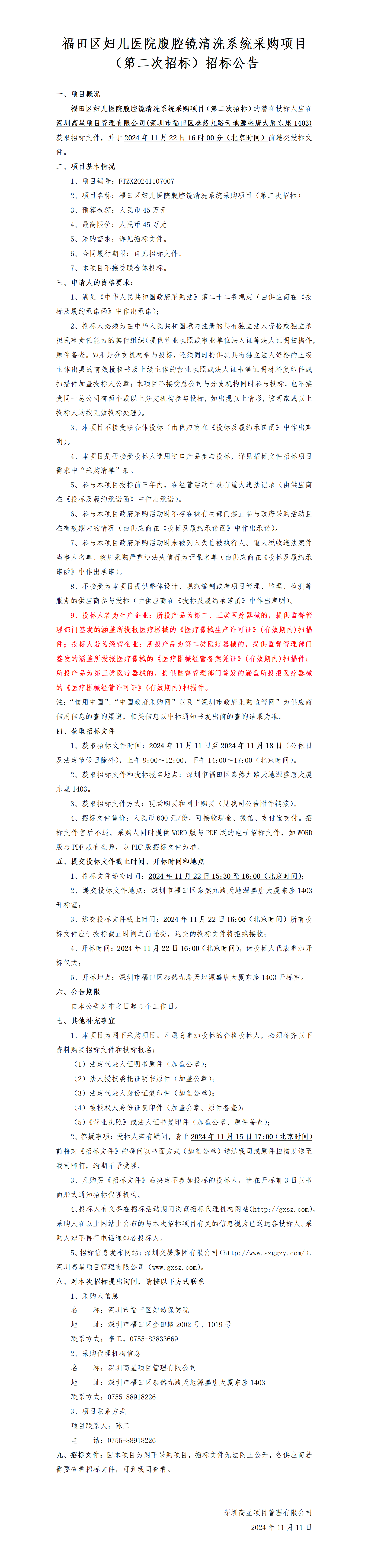 【招标公告】福田区妇儿医院腹腔镜清洗系统采购项目(第二次招标)