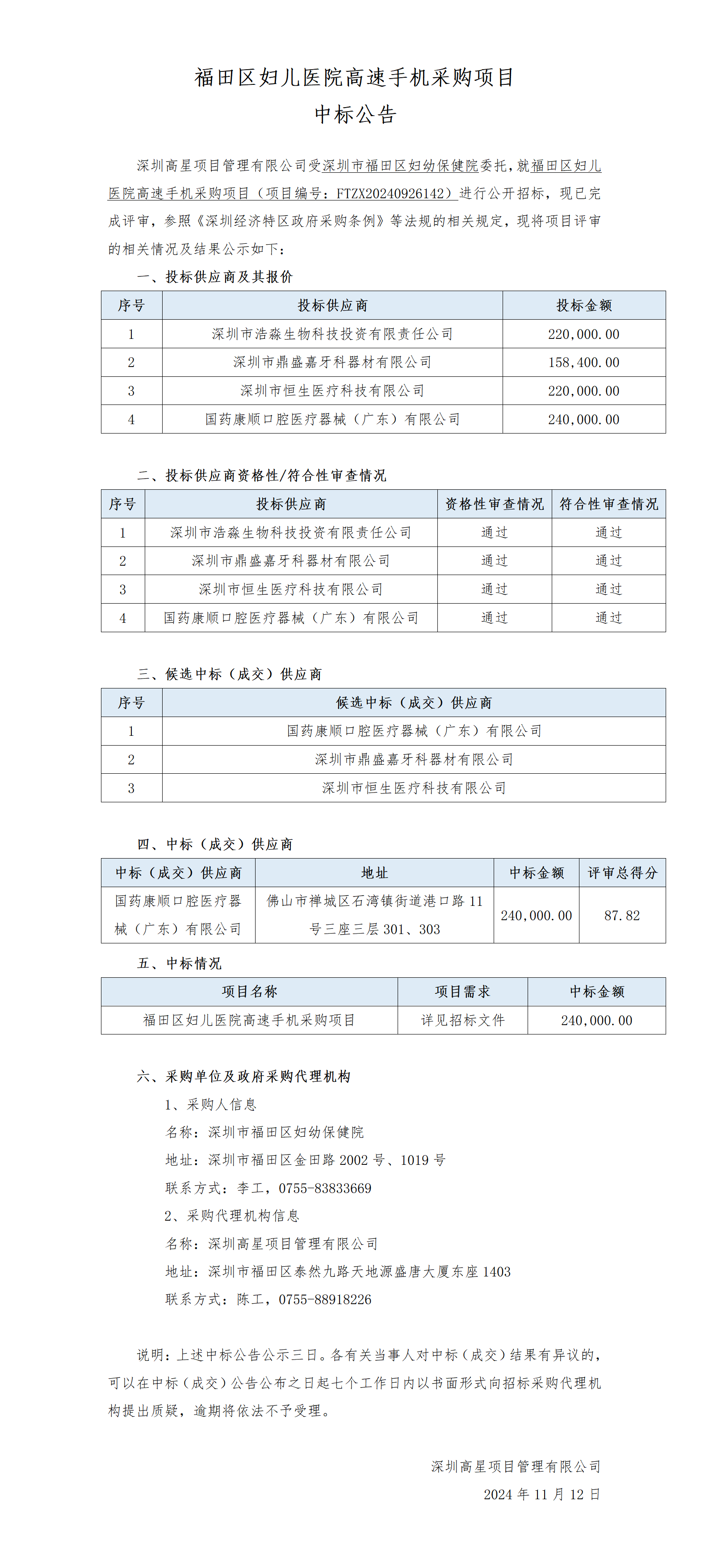 【中标公告】福田区妇儿医院高速手机采购项目