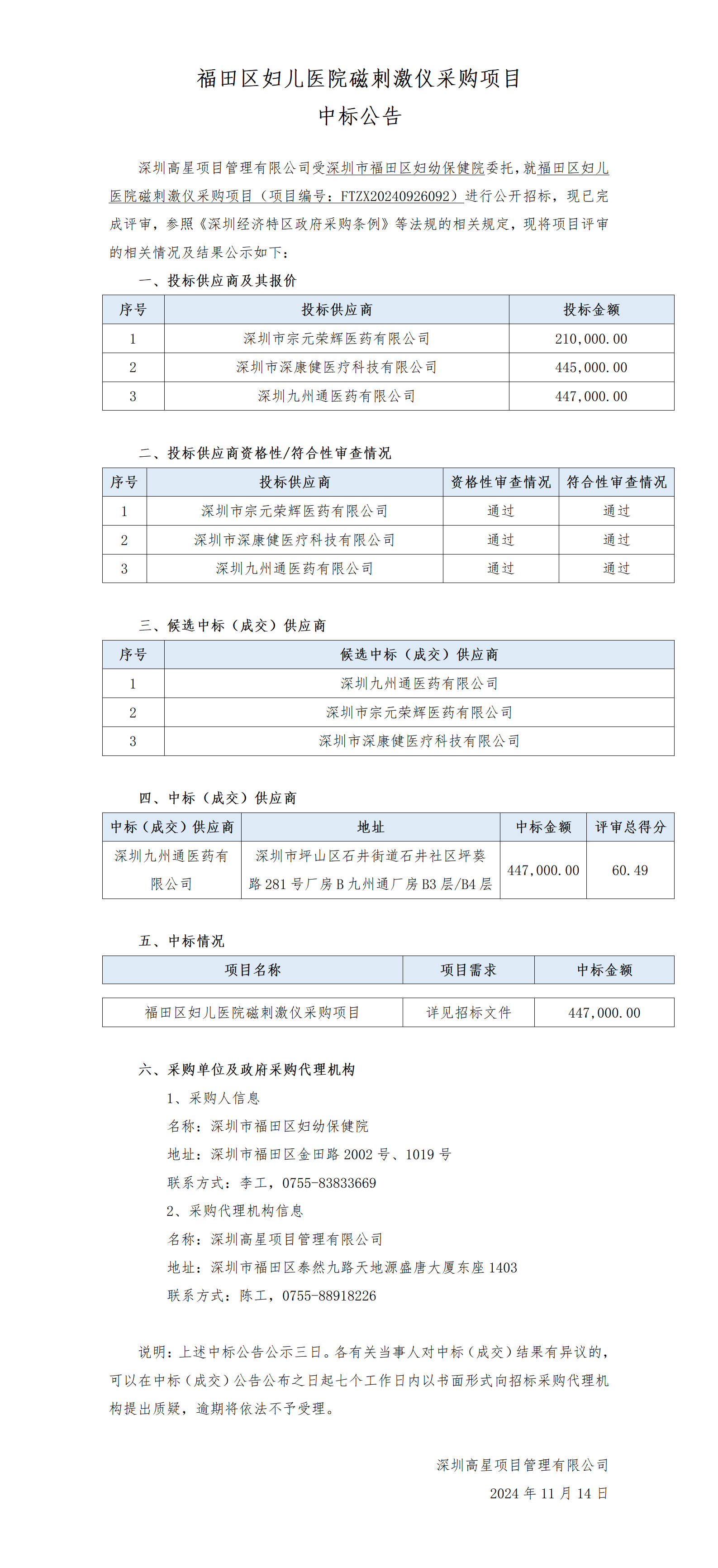 【中标公告】福田区妇儿医院磁刺激仪采购项目