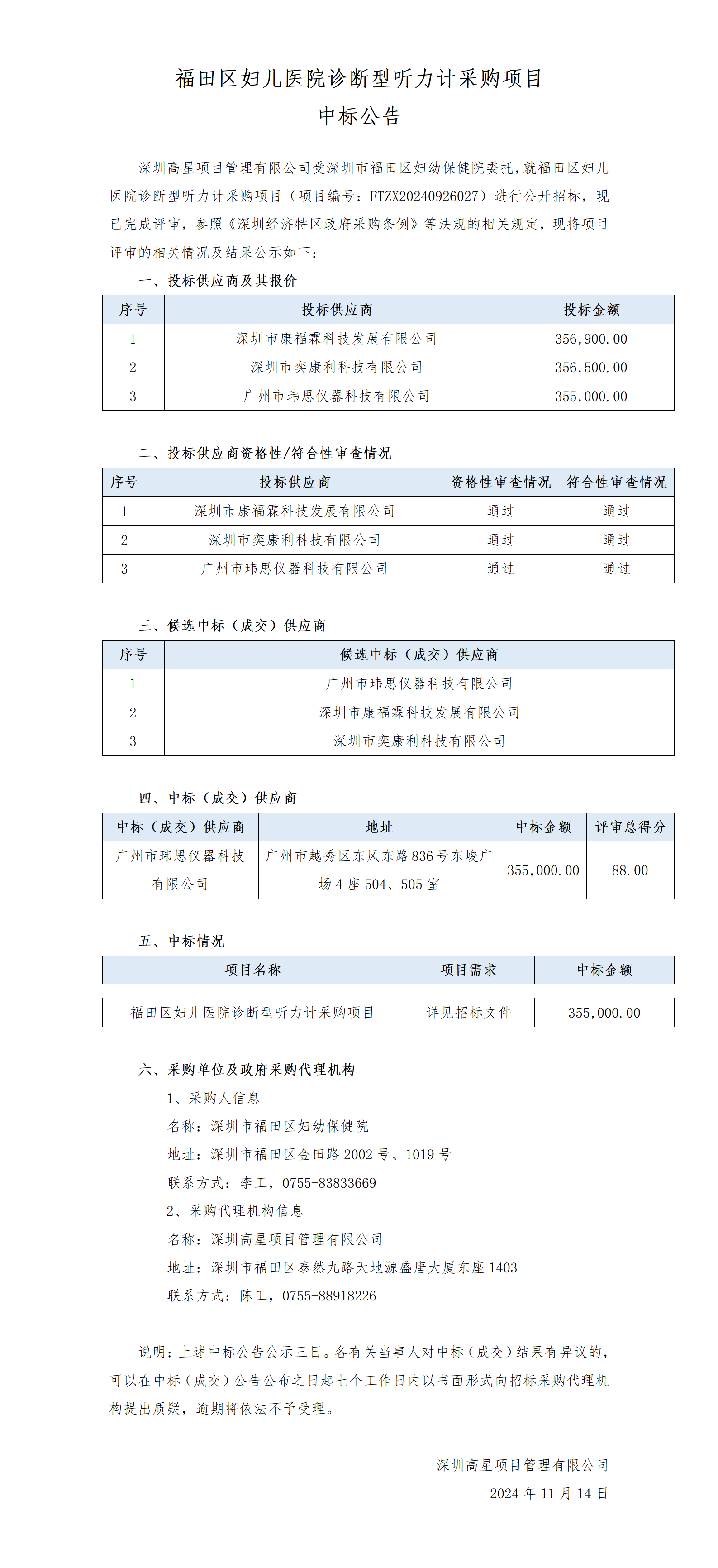 【中标公告】福田区妇儿医院诊断型听力计采购项目