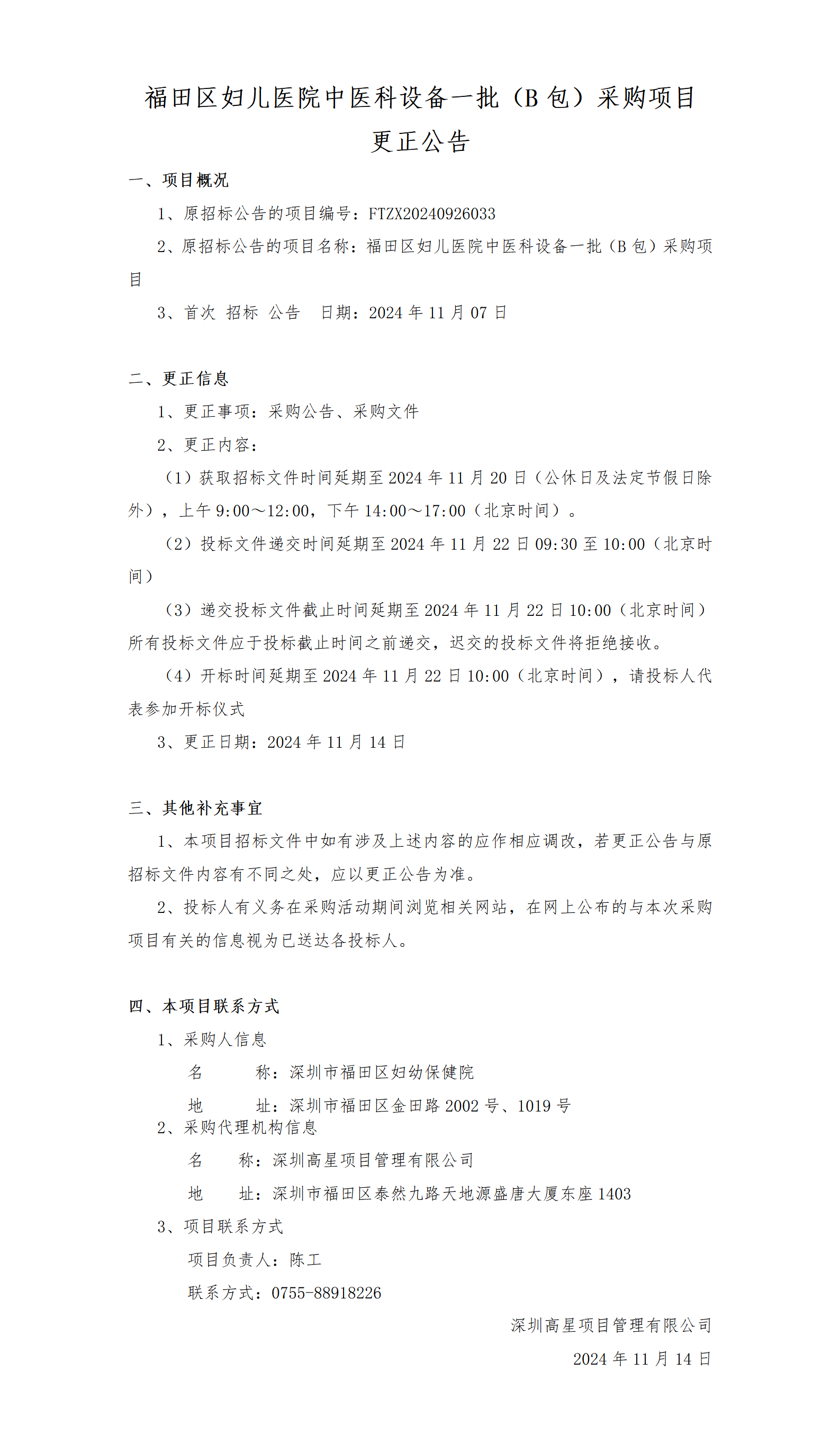 【更正公告】福田区妇儿医院中医科设备一批(B包)采购项目