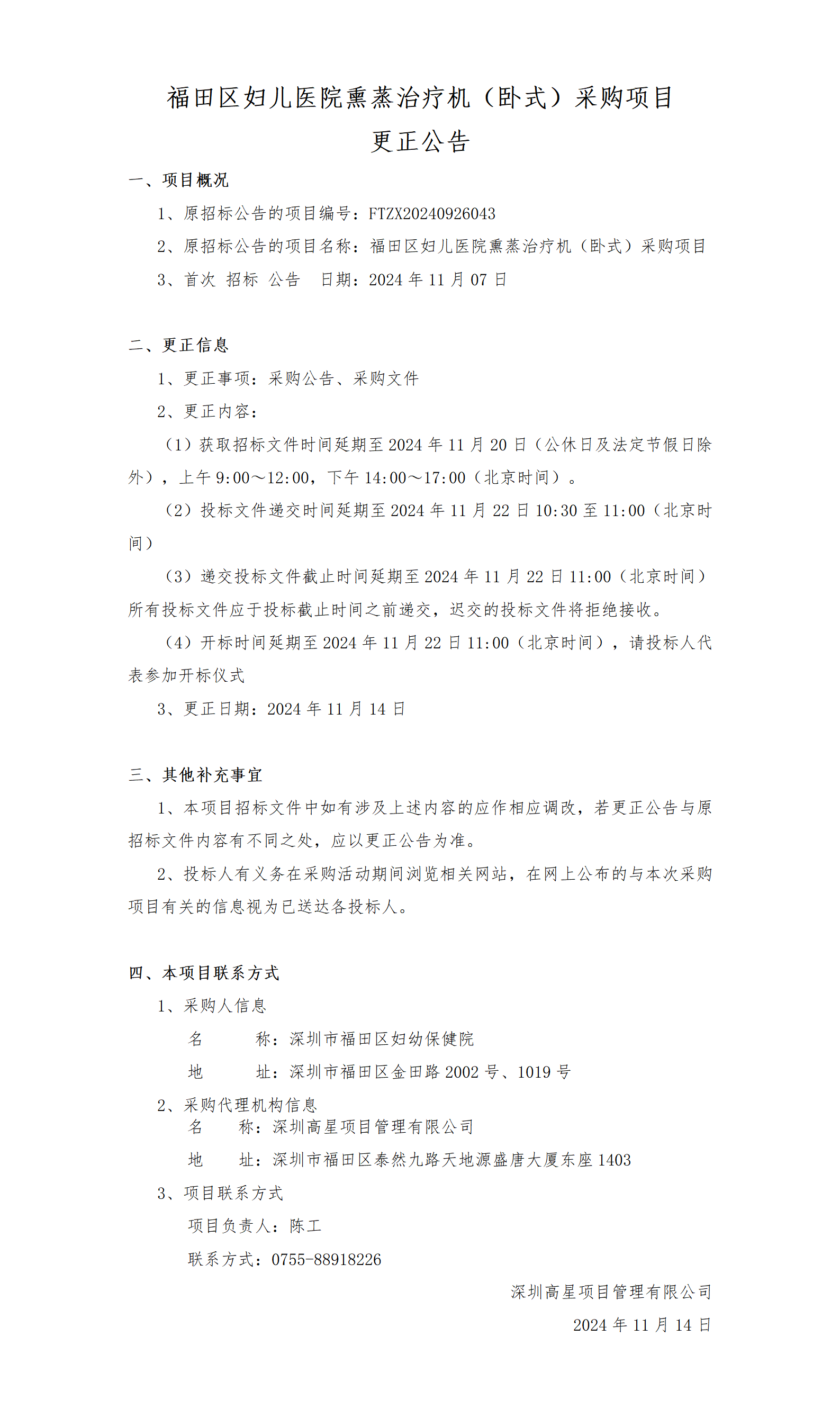 【更正公告】福田区妇儿医院熏蒸治疗机(卧式)采购项目