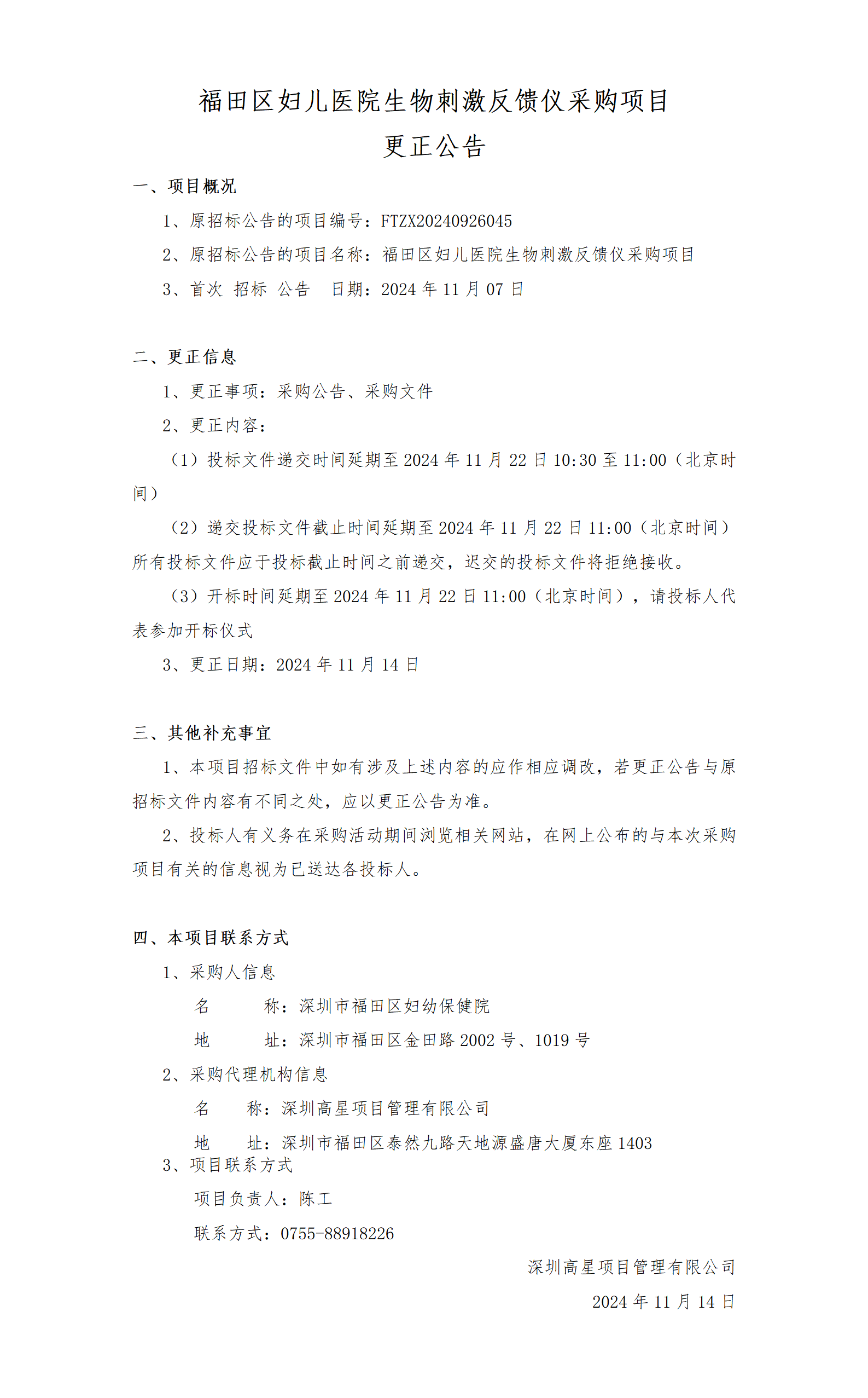 【更正公告】福田区妇儿医院生物刺激反馈仪采购项目