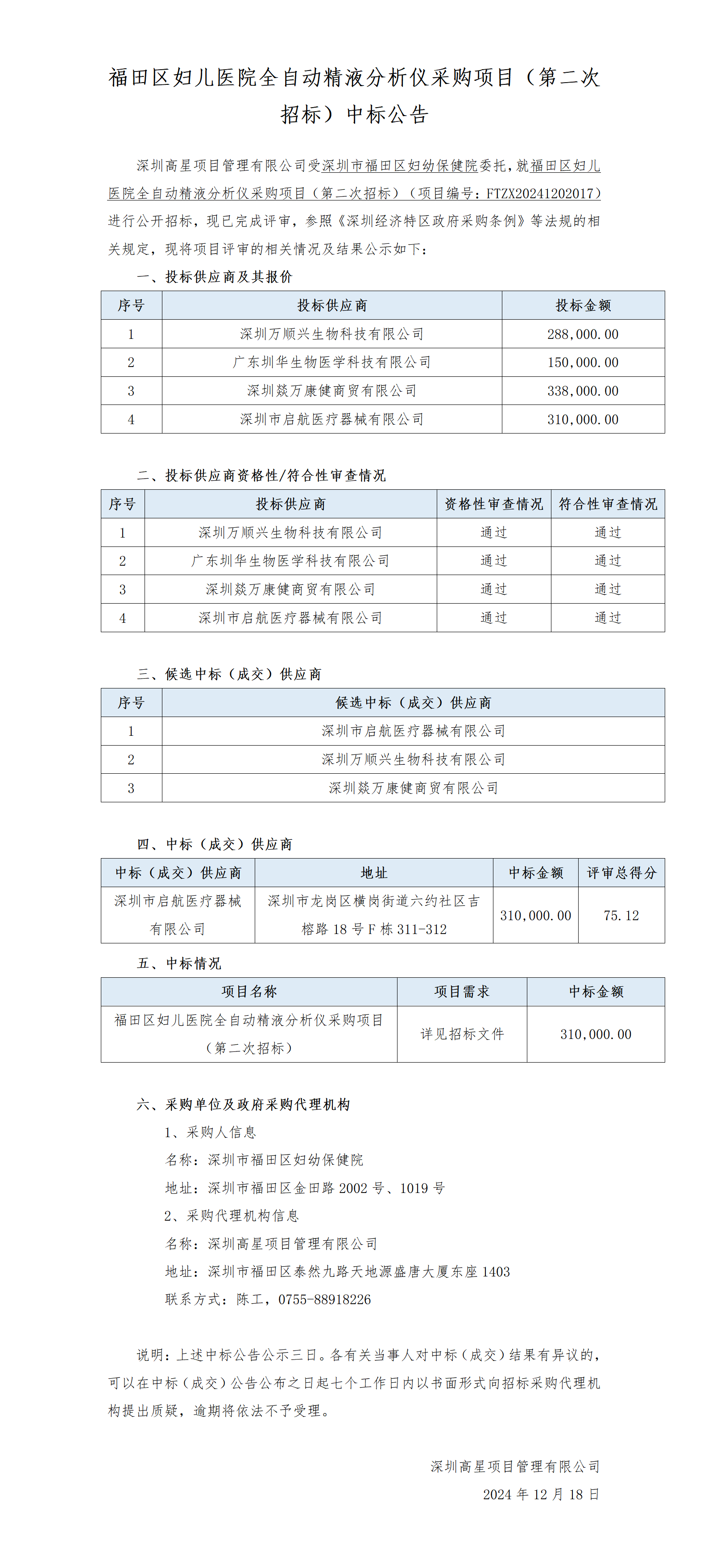 福田区妇儿医院全自动精液分析仪采购项目(第二次 招标)中标公告