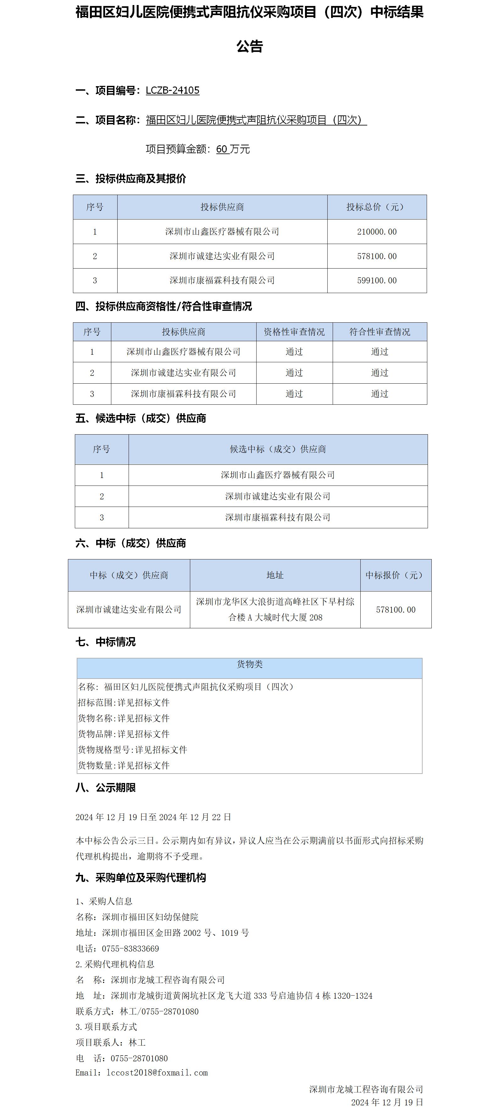 福田区妇儿医院便携式声阻抗仪采购项目(四次)中标结果公告