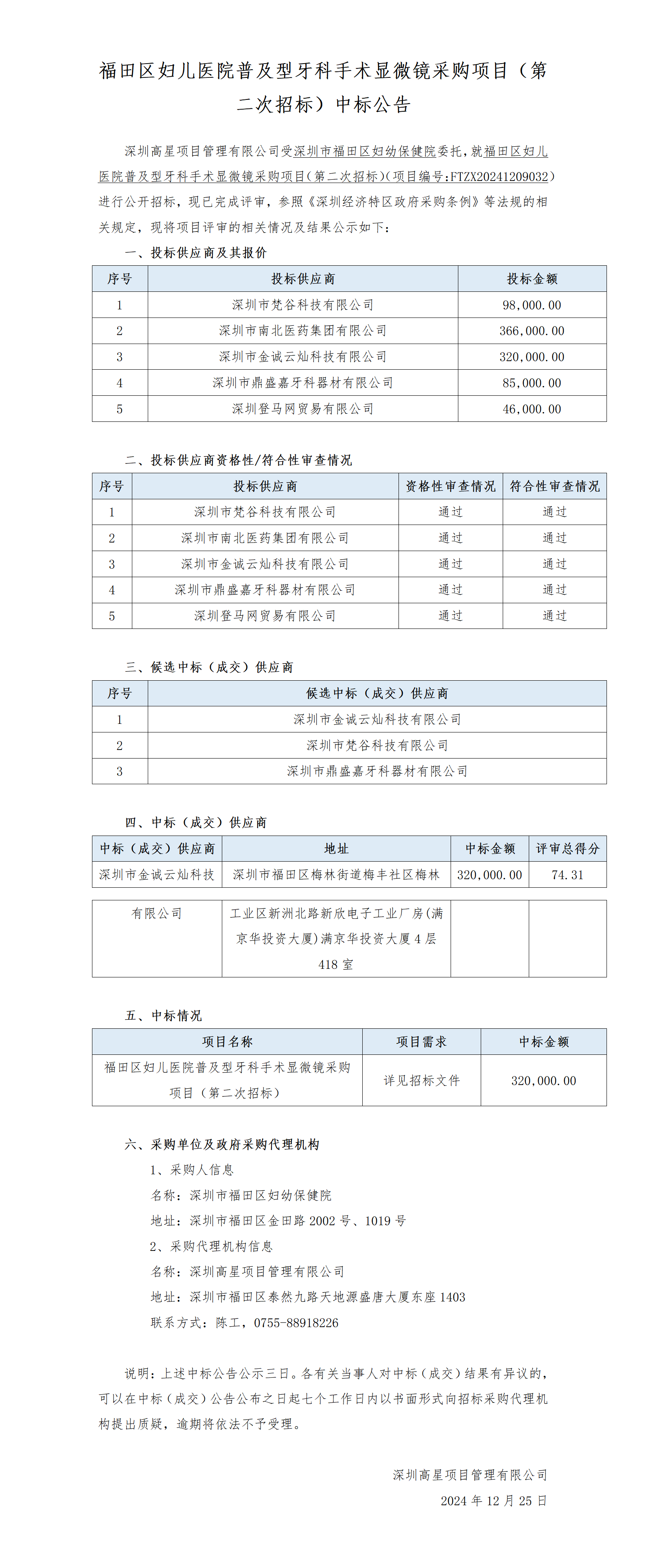 福田区妇儿医院普及型牙科手术显微镜采购项目(第二次招标)中标公告
