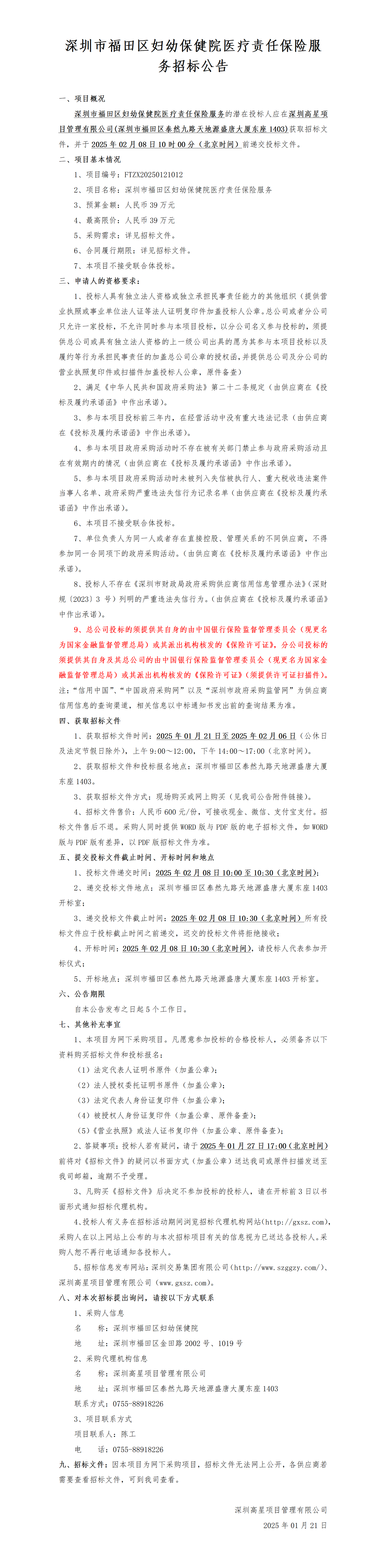 深圳市福田区妇幼保健院医疗责任保险服务招标公告