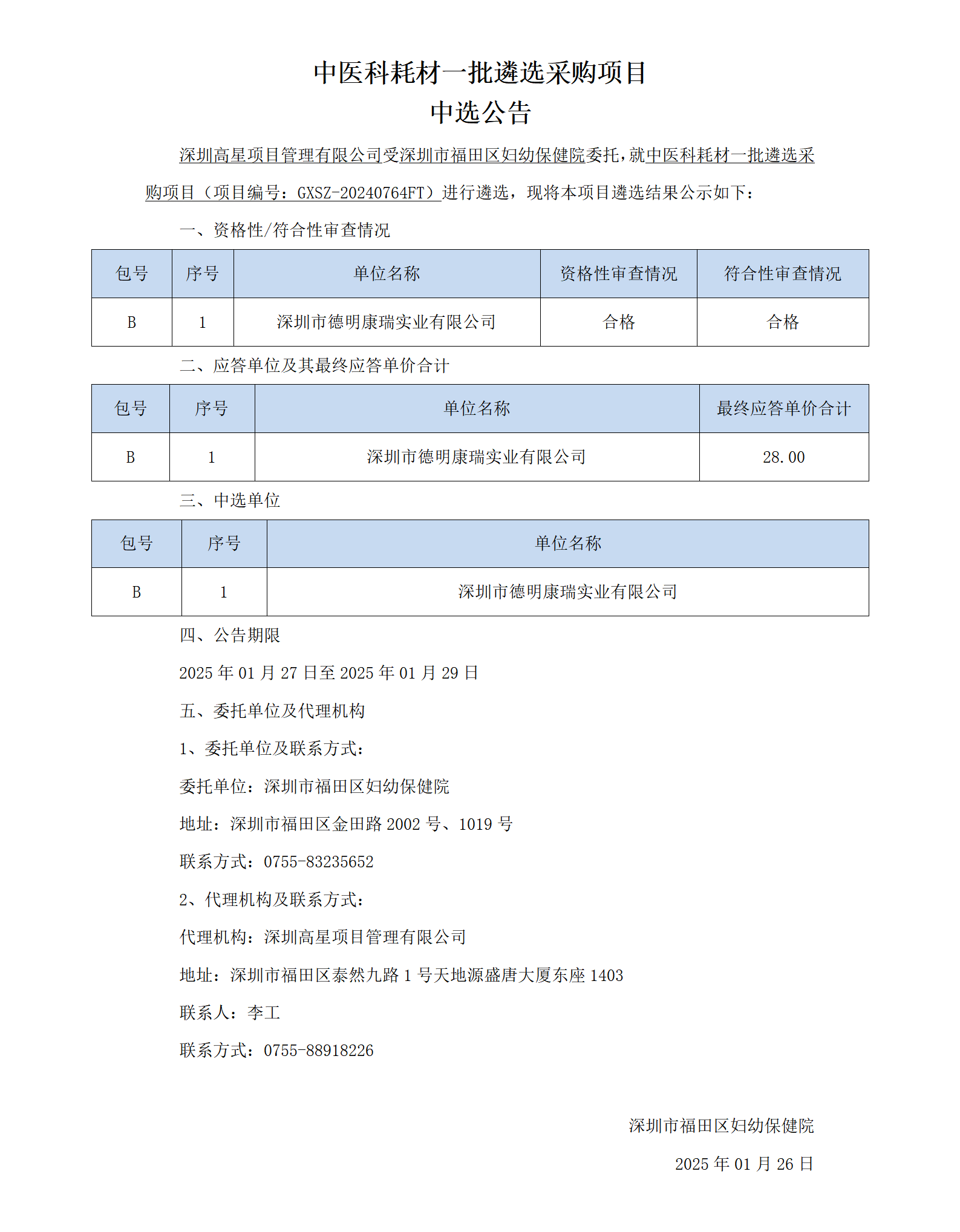 中医科耗材一批遴选采购项目中选公告