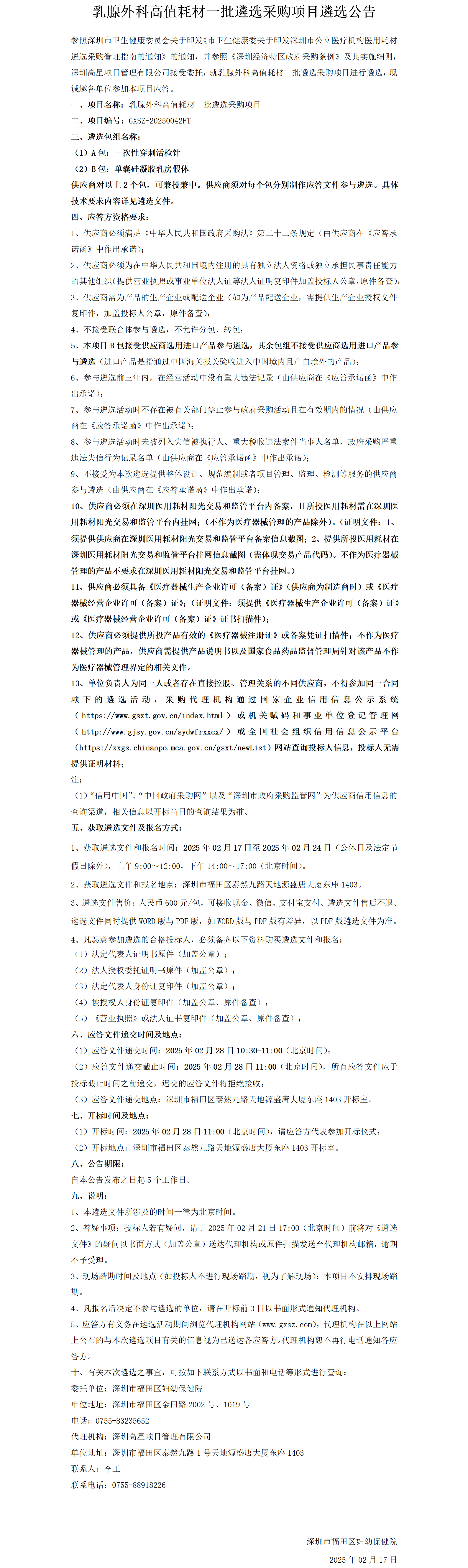 乳腺外科高值耗材一批遴选采购项目遴选公告