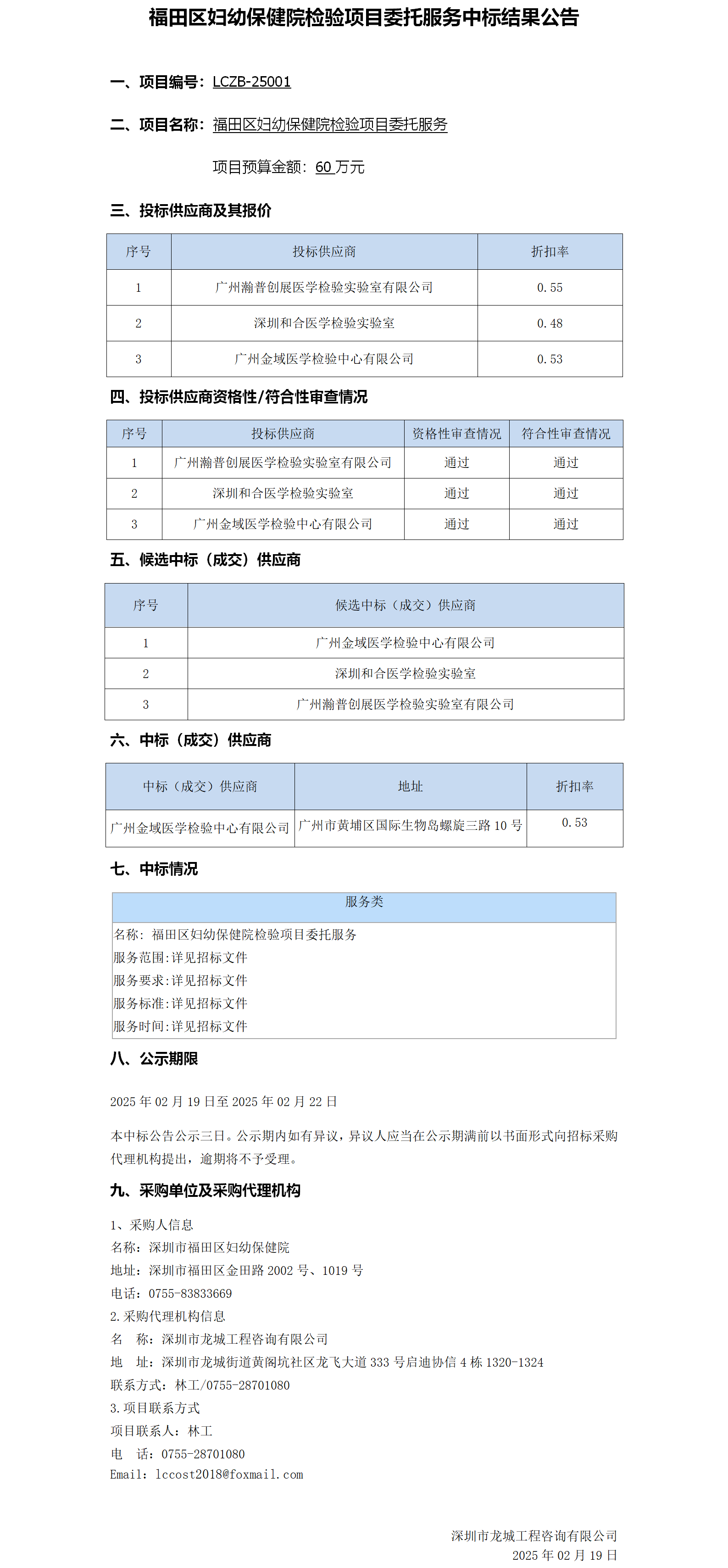 福田区妇幼保健院检验项目委托服务中标结果公告