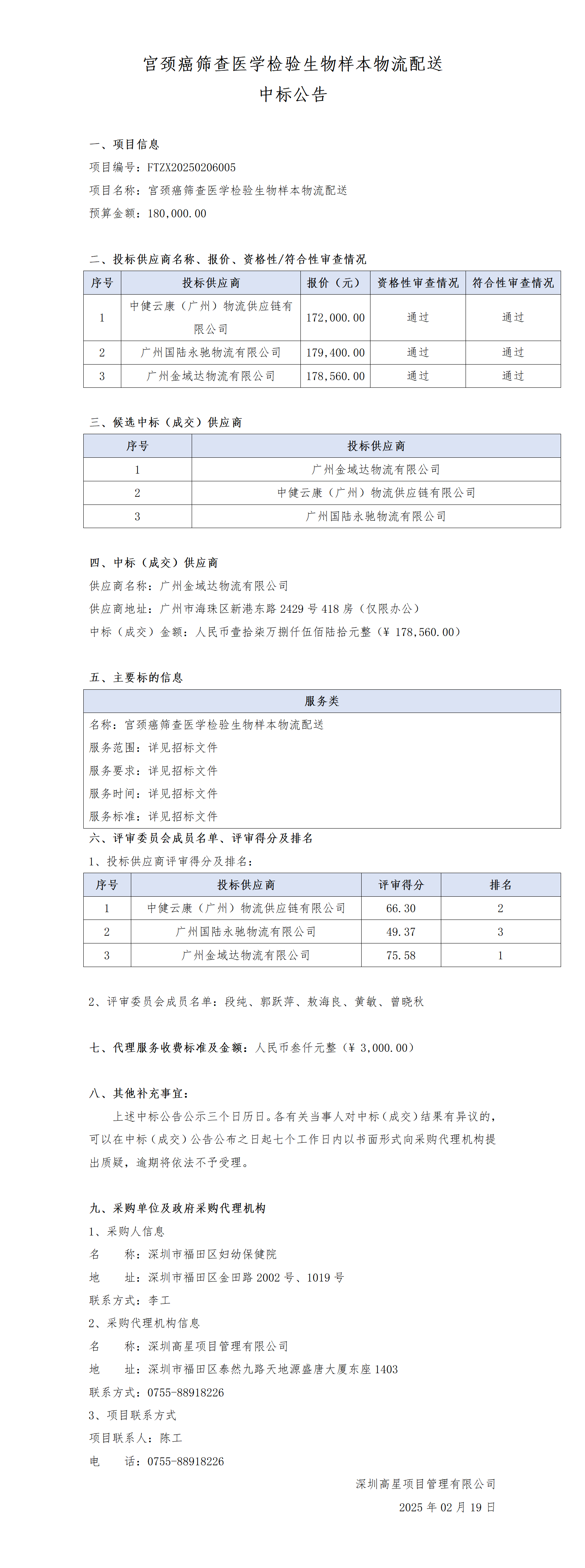 宫颈癌筛查医学检验生物样本物流配送中标公告