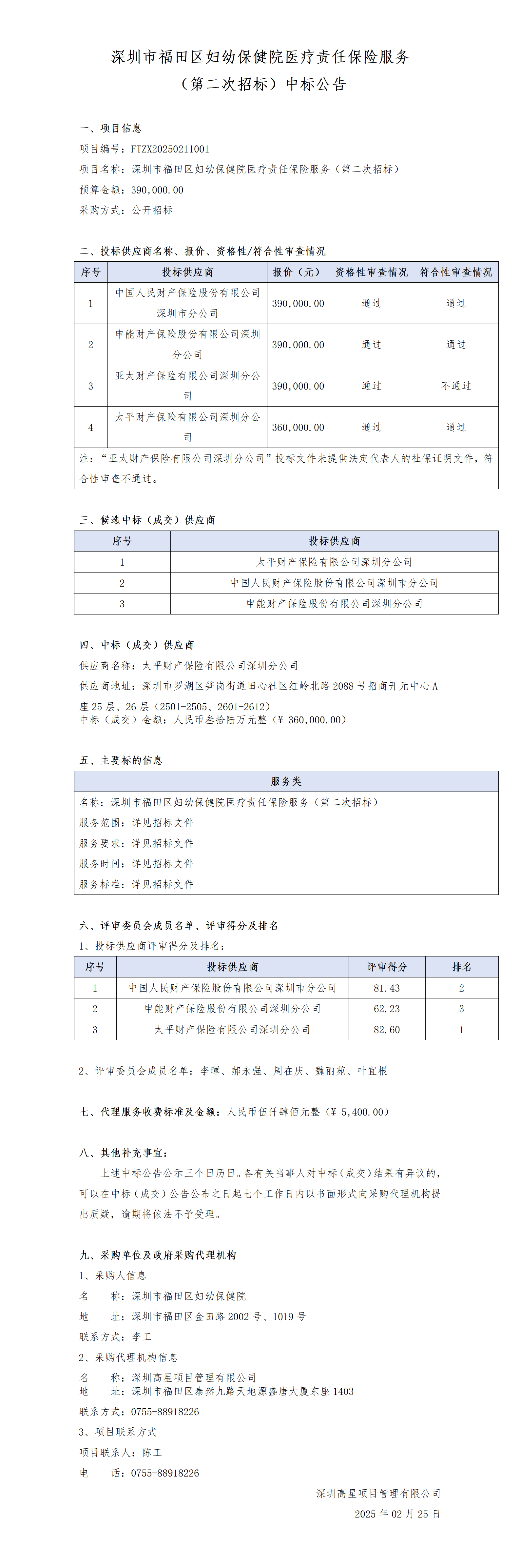 深圳市福田区妇幼保健院医疗责任保险服务(第二次招标)中标公告