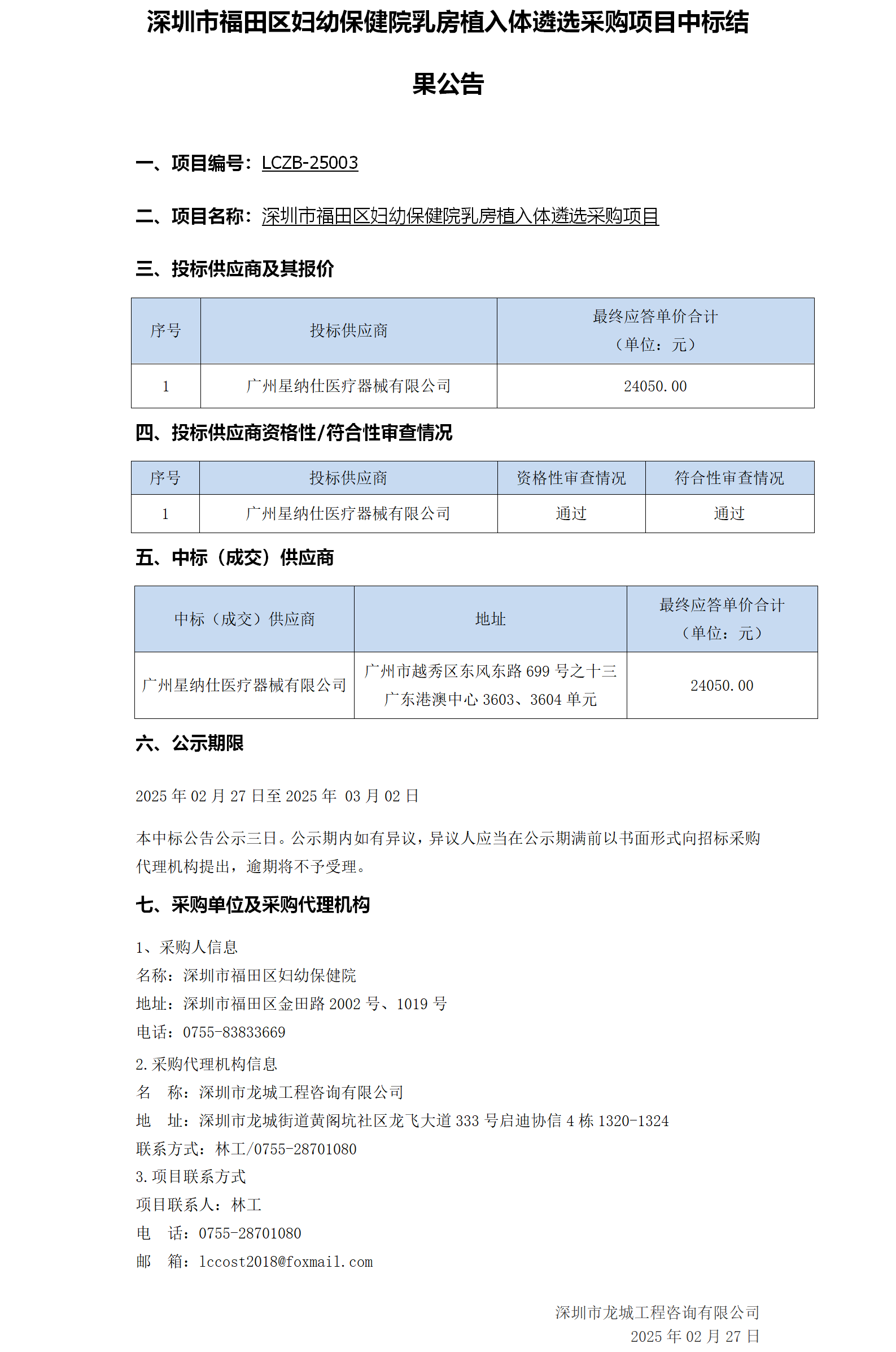 深圳市福田区妇幼保健院乳房植入体遴选采购项目中标结果公告