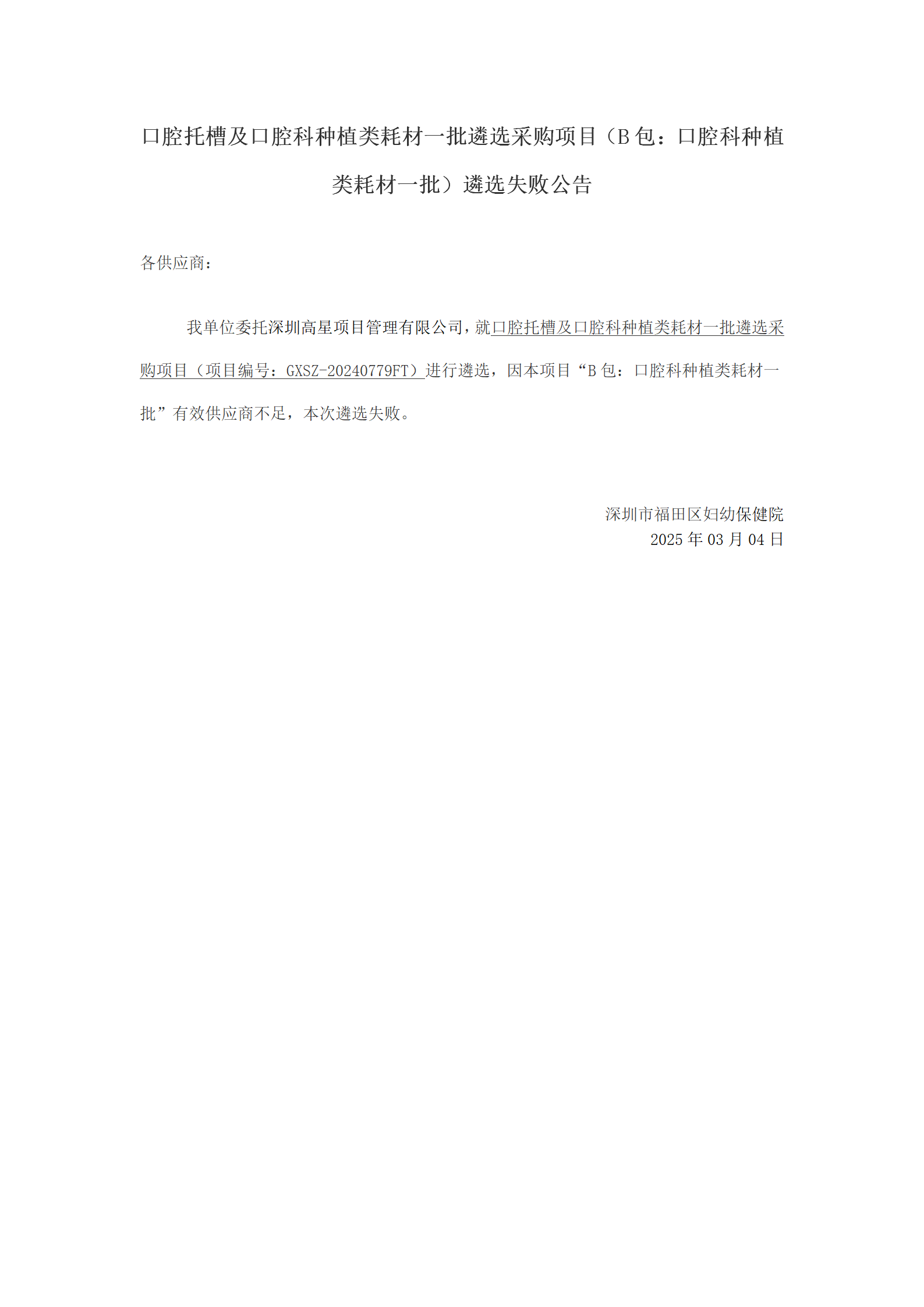 口腔托槽及口腔科种植类耗材一批遴选采购项目(B包:口腔科种植类耗材一批)遴选失败公告
