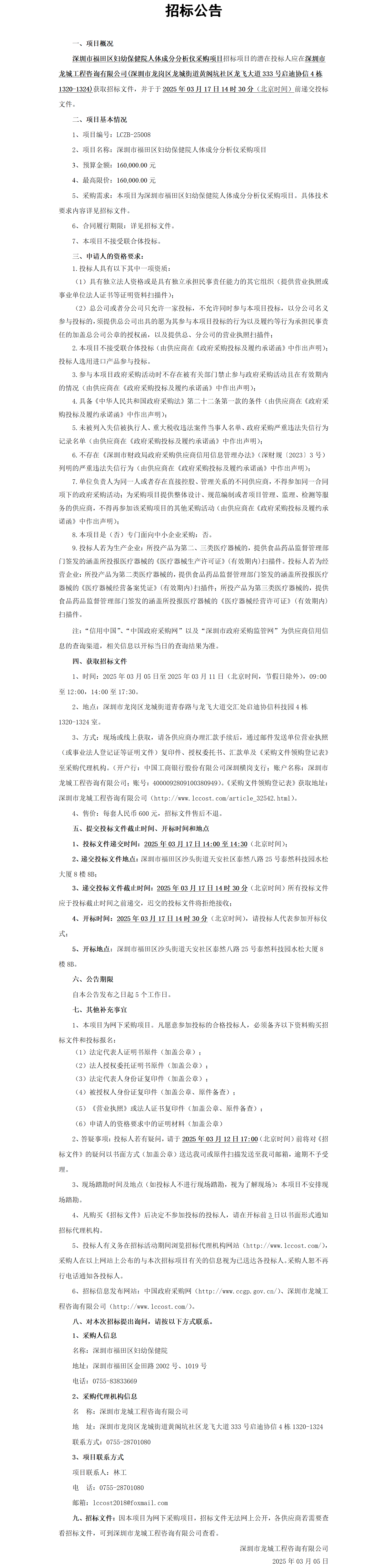 深圳市福田区妇幼保健院人体成分分析仪采购项目招标公告