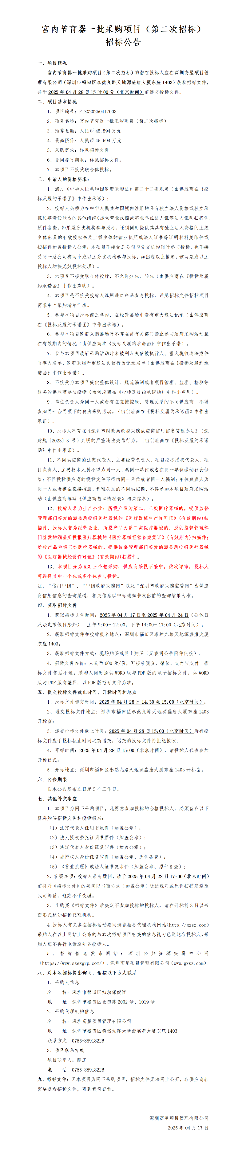 宫内节育器一批采购项目(第二次招标)招标公告