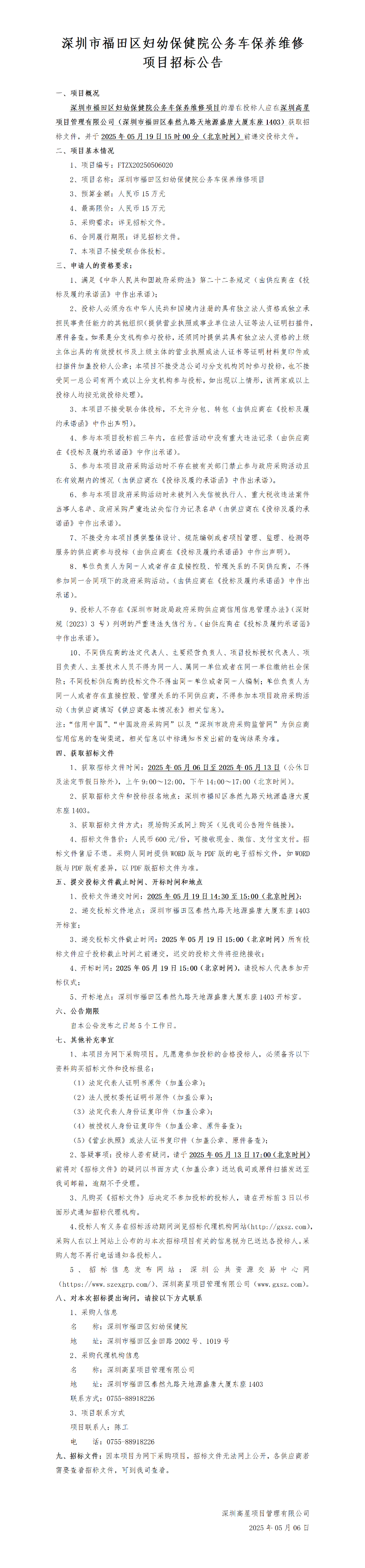 深圳市福田区妇幼保健院公务车保养维修项目招标公告