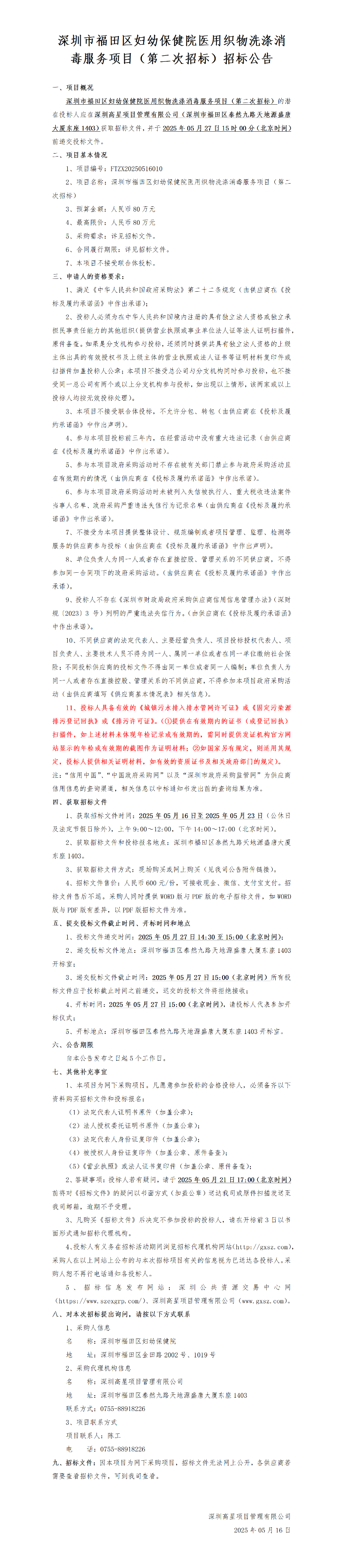 深圳市福田区妇幼保健院医用织物洗涤消毒服务项目(第二次招标)招标公告