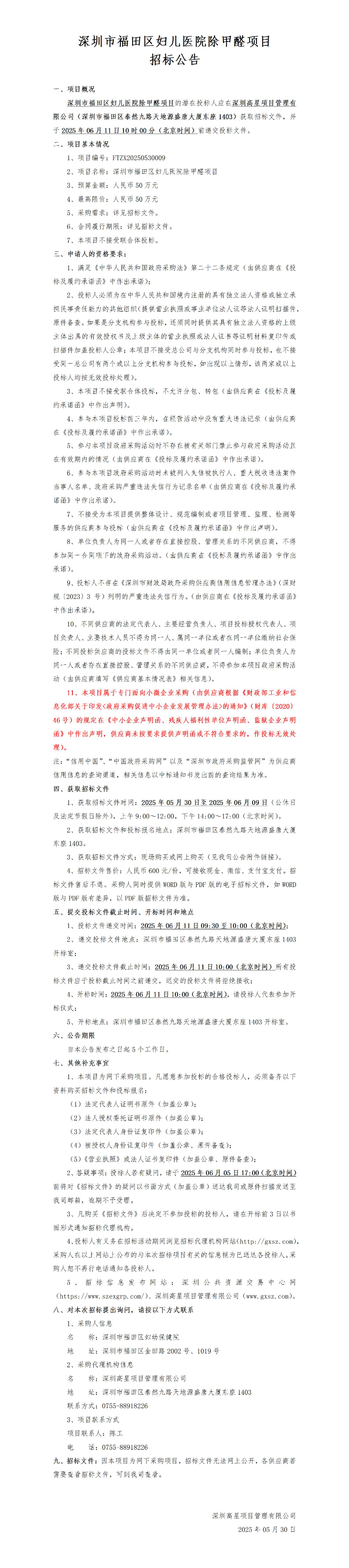 深圳市福田区妇儿医院除甲醛项目招标公告