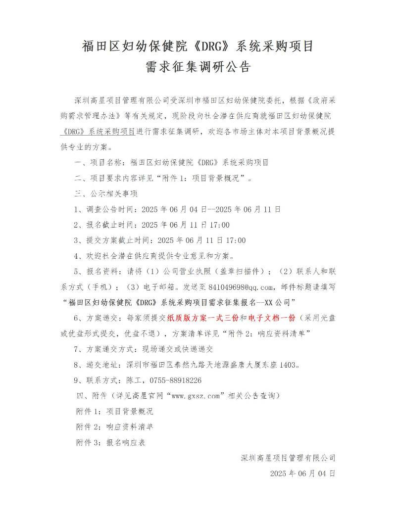 福田区妇幼保健院《DRG》系统采购项目需求征集调研公告