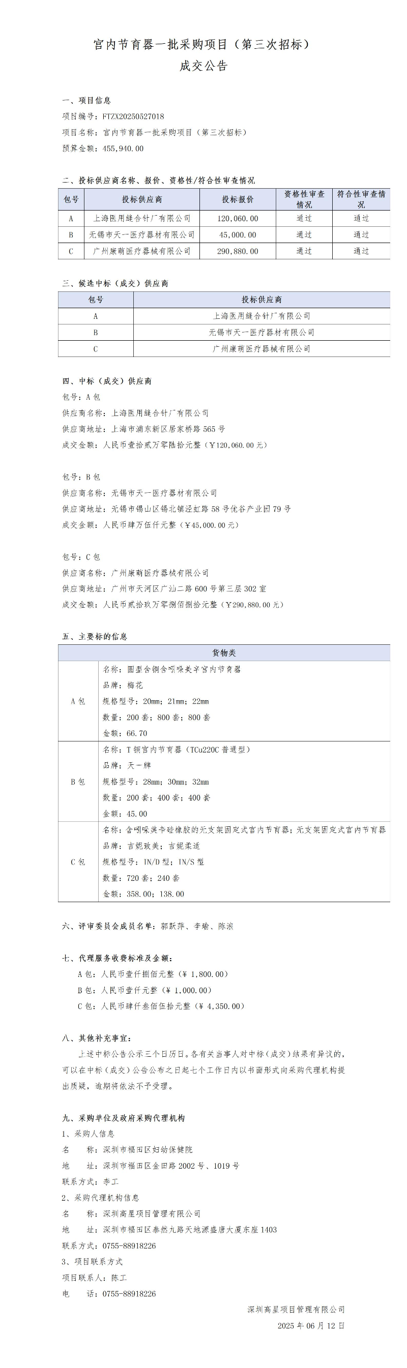 宫内节育器一批采购项目(第三次招标) 成交公告