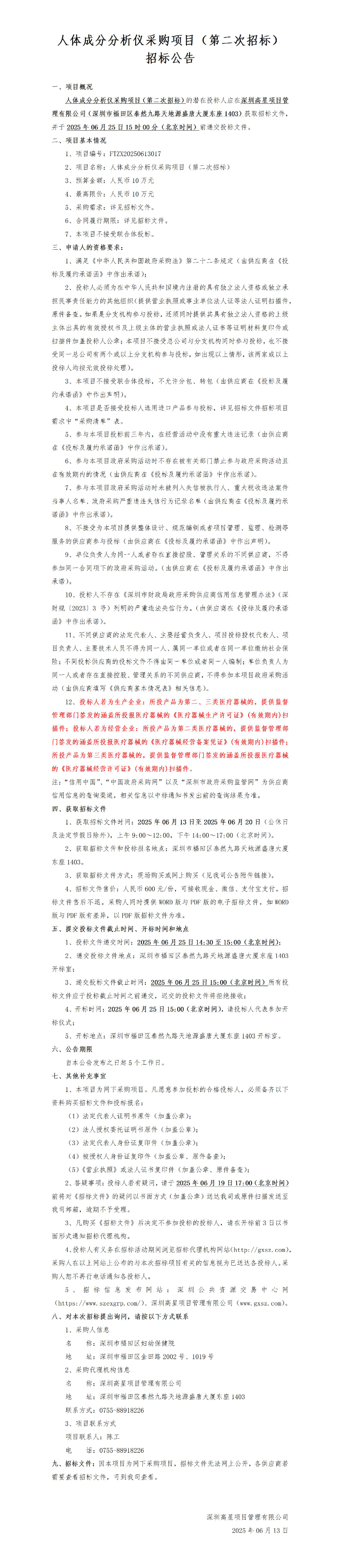 人体成分分析仪采购项目(第二次招标)招标公告