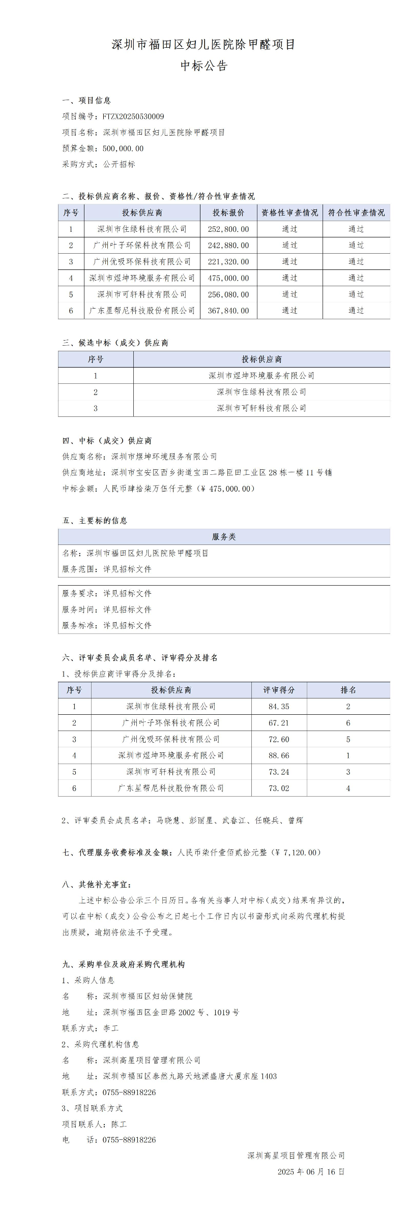 深圳市福田区妇儿医院除甲醛项目中标公告