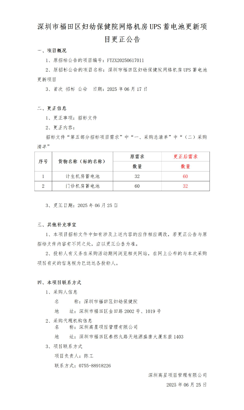 深圳市福田区妇幼保健院网络机房UPS蓄电池更新项目更正公告