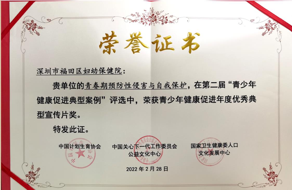 由中国计划生育协会、国家卫生健康委人口文化发展中心、中国关心下一代工作委员会公益文化中心联合举办的第二届全国“青少年健康促进典型案例”评选结果近期揭晓,福田区妇幼保健院作品《青春期预防性侵害与自我保护》动画视频突破重围喜获国家级“优秀宣传片奖”。