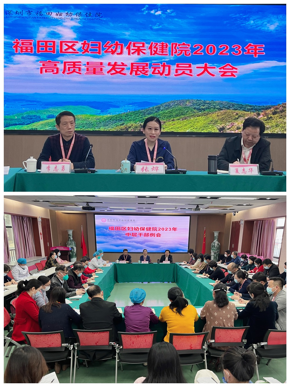 2023年2月1日下午,福田区妇幼保健院召开中层干部例会暨医院高质量发展动员会,张烨书记主持,院领导班子及中层干部参加。夏志华院长作工作部署,要求:1、对标三甲加强制度建设,2、大力推行科主任负责制,3、强主业、发展亚专科,4、加强服务满意度的提升,5、加强绩效增量的激励,6、大力推进三级医院的创建,7、加强新大楼建设的统筹力度,8、加快推进计生大楼的使用,9、做好迎接妇幼年度督导工作。张烨书记指出2023年是全面贯彻落实党的二十大精神的开局之年,开好局起好步至关重要、责任重大、意义深远;要认真领悟《深圳市公立医院高质量发展实施方案》,对接福田区“卫生强区、健康城区2.0版”总体目标,稳步推进妇儿医院建设,争创三级医院,牢牢扛起医院高质量发展的责任与担当,争做医院发展的“参与者”、“推动者”和“建设者”,为福田妇幼高质量发展做出更大贡献!