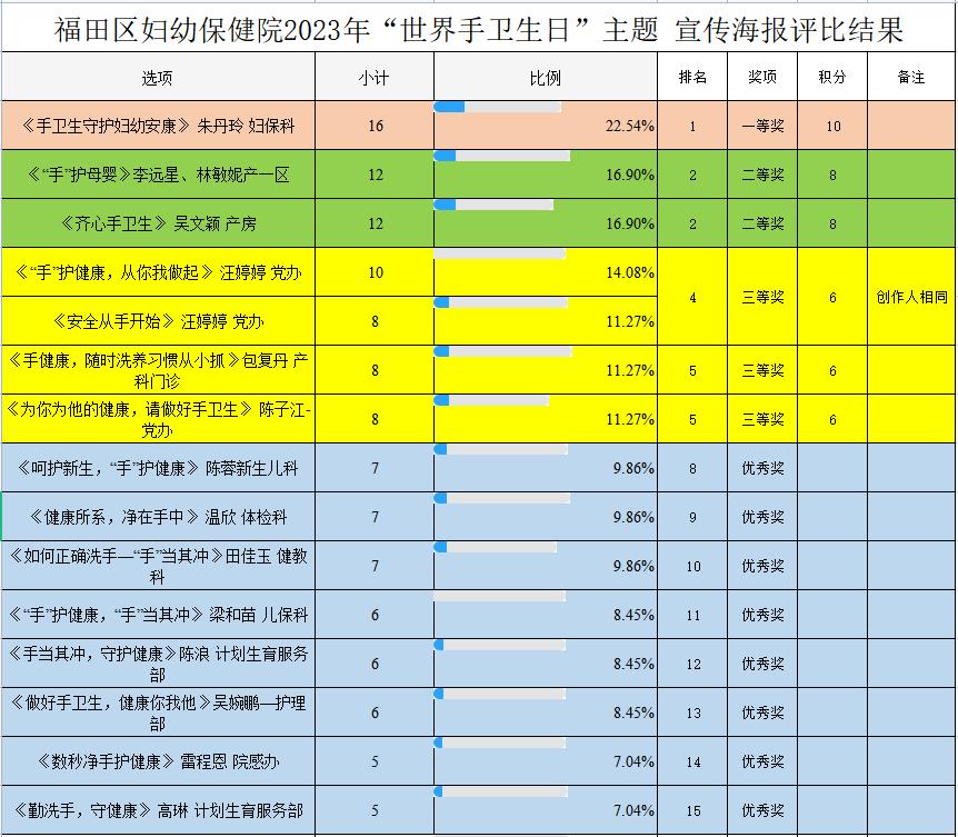 手卫生海报作品大赛是本次主题宣传月活动的重要内容之一。来自全院38个科室的62幅海报作品经宣传发动、层层遴选、最终评审环节,最终评选出15幅获奖作品,其中一等奖1名、二等奖2名、三等奖4名及优秀奖8名。