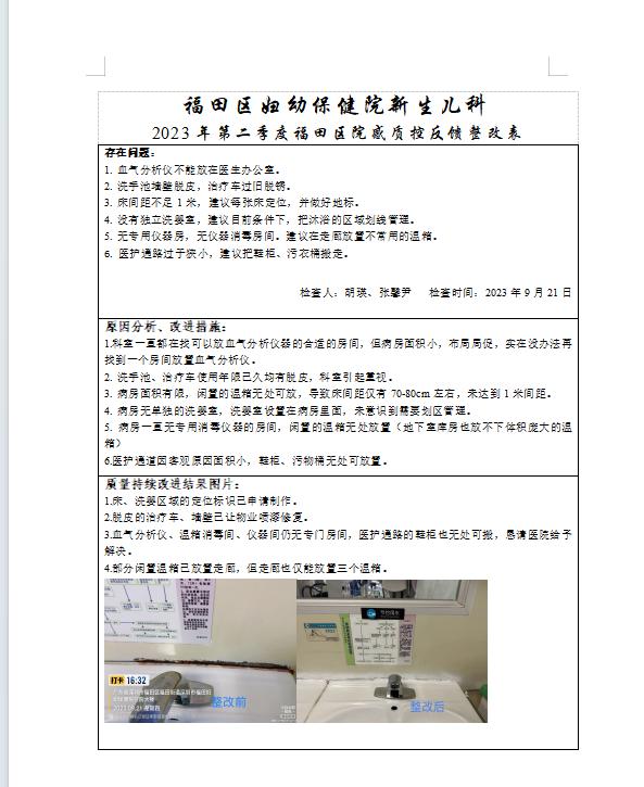 2023年9月21日下午,区质控中心邀请市级专家对福田区妇幼保健院进行了院感防控的专项检查。检查组通过现场观察、查阅资料和提问等方式,全面检查并评估了新生儿科和产房医院感染防控工作。